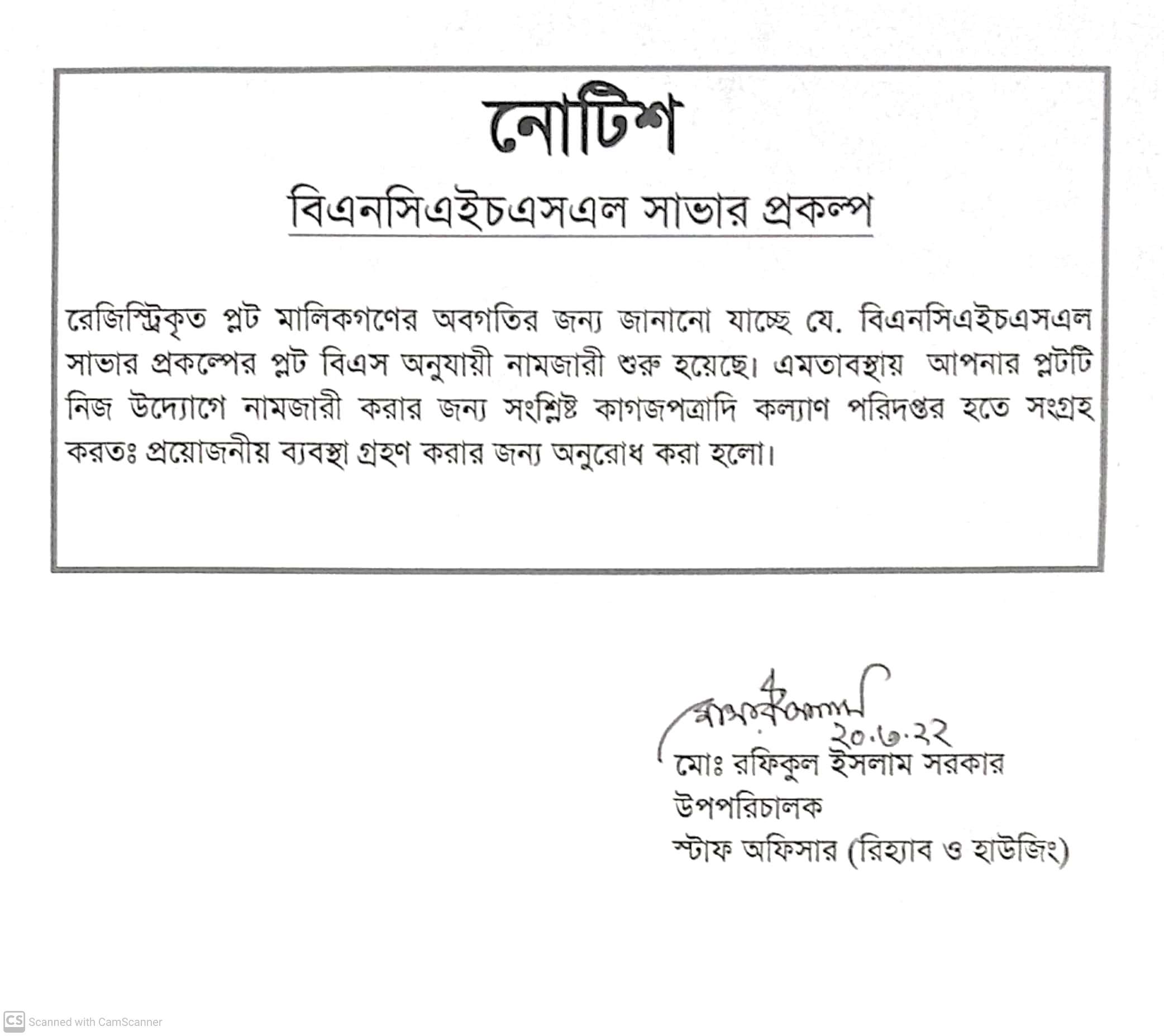 বিএনসিএইচএসএল সাভার প্রকল্পের প্লটসমুহের নামজারি করন প্রসঙ্গে